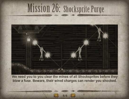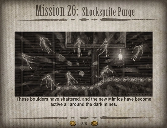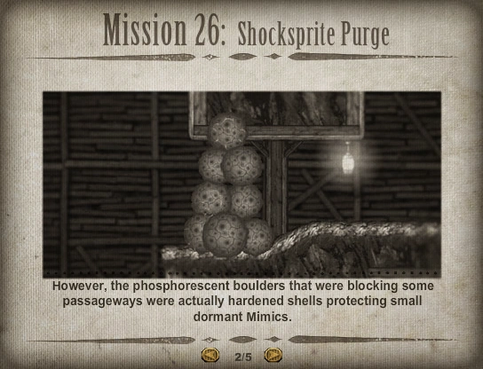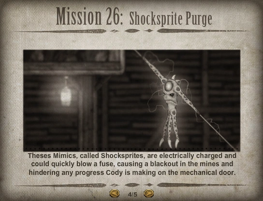 Quest giver: Cody found some old schematics, which should help him get the door of Deadrock Canyon opened. However, the phosphorescent boulders that were blocking some passageways were actually hardened shells protecting small dormant Mimics. These boulders have shattered, and the new Mimics have become active all around the dark mines. These Mimics, called Shocksprites, are electrically charged, and could quickly blow a fuse, causing a blackout in the mines and hindering any progress Cody is making on the mechanical door. We need you to clear all the mines of Shocksprites before they blow a fuse. Beware, their wired charges can rendered you shocked.
