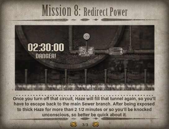 Quest giver: We're detecting a large disturbance in the eastern branch of the Steamport Sewers, but we don't have enough circuits in the area to power another set of protective Ether Tubes. There's a western branch of the Sewer that had a circuit installed, which we'll need to redirect so we can power this new stretch of tunnels. Once you turn off that circuit, there's a good chance that haze will start filling that tunnel, so you'll have to escape back to the main Sewer branch. After being exposed to thick haze for more than 2 minutes of so, you'll be knocked unconscious, so better be quick about it.