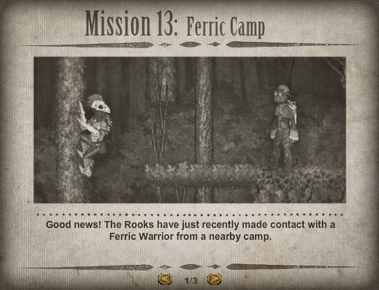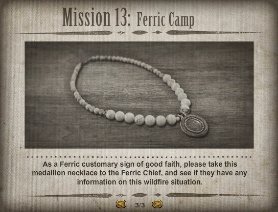 Quest giver: The Rooks have made contact with a Ferric Warrior from a nearby camp. The Ferrics are opening up their southwest gate to allow for your entrance. As a Ferric customary sign of good faith, please take this medallion necklace to the Ferric Chief, and see if they have any information on this wildfire situation.