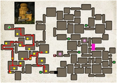Blue square indicates Cody's location. Yellow squares are Embermites; red squares mark each of the crates where the Embermites should be lured into. An image of one of those crates is also attached