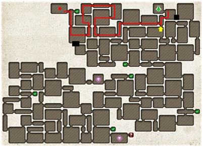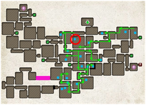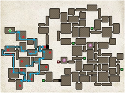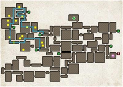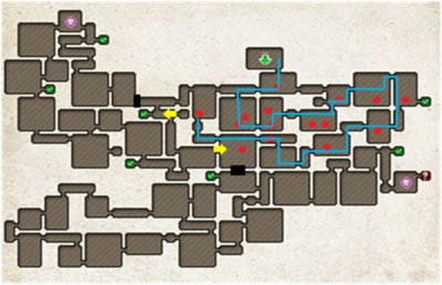 The blue line shows the fastest path to complete the quest; the white dots mark the Clampbrights (also showed on top left) and the red ex's show the path the player should avoid. The yellow square shows the circuit breaker.