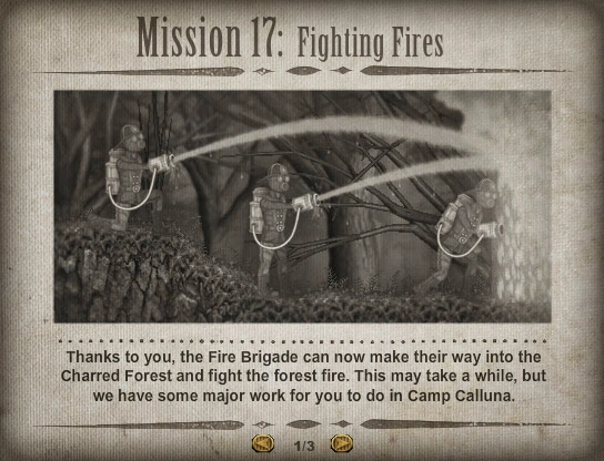 Quest giver: While waiting for the Fire Brigade to do their work below, you are in charge of putting out several fires that have occurred around Camp Calluna. Use Watergrubs to your advantage when fighting the fires, and be sure to find all 10 locations.