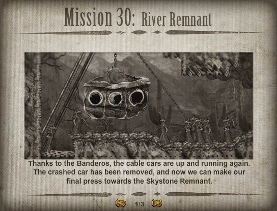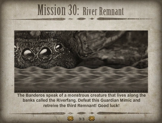 Quest giver: Thanks to the Banderos, the cable cars are up and running again. The crashed car has been removed, and now we can make our final press to the Skystone Remnant. We believe the Remnant lies deep in Deadrock Canyon, on the banks of the Blueridge River. Be careful as you travel, because one wrong move could send you down the raging river. The Banderos speak of a monstrous creature that lives along the banks called the Riverfang. Defeat this Guardian Mimic and retrieve the third Remnant! Good luck!