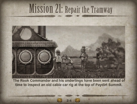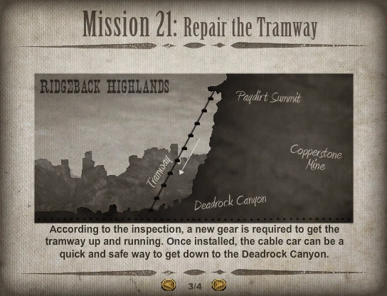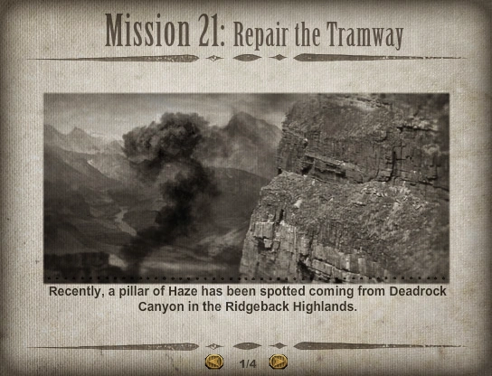 Quest giver: A Pillar of Haze has been spotted coming from Deadrock Canyon in the Ridgeback Highlands. The Rook Commander and his underlings have been sent ahead of time to inspect an old cable car rig at the top of Paydirt Summit. According to the inspection, a new gear is required to get the tramway up and running. Once installed, the cable car can be a quick and safe way to get to the valley floor. Install the replacement gear on the Tramway's motor and send the Commander and his Rooks safely down to Deadrock Canyon.