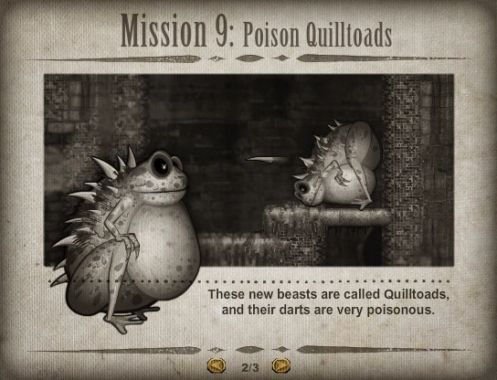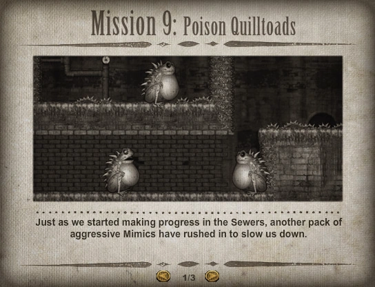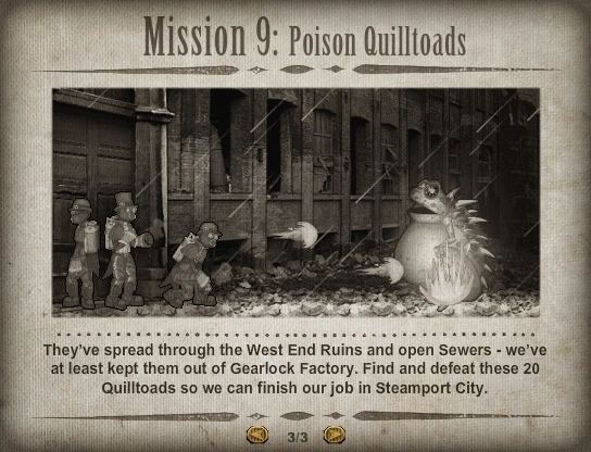 Quest giver: Just as we started making progress in the Sewers, another pack of aggressive Mimics have rushed in to slow us down. These new beasts are called Quilltoads, and their darts are very poisonous. They're spread through the West End Ruins and open Sewers - we've at least kept them out of Gearlock Factory. Find and defeat these 20 Quilltoads so we can finish our job in Steamport City.