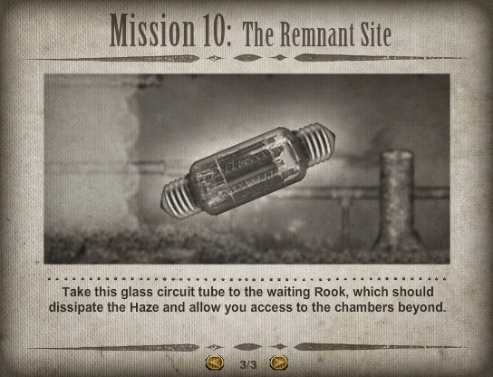 Quest giver: We are finally closing in on the site of the Skystone Remnant. A wall of haze seems to be the last hazard in our way, though this Remnant may also be protected by a Mimic Guardian as before. Take this glass circuit tube to the waiting Rook, which should dissipate the haze and allow you access to the chambers beyond.