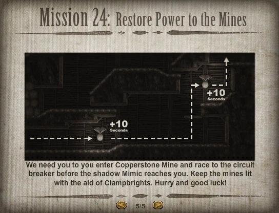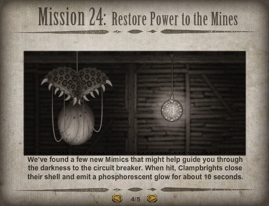 Quest giver: Copperstone Mine is now fully aired out and accessible. However, the power inside is not functioning, leaving the mines in complete darkness. Several Rooks have tried to enter the mines, but they were quickly captured and thrown out by a strong Mimic lurking in the shadows. The Banderos told us of a circuit breaker that lies deep within the mines that should restore the power and the lights. We've found a few new Mimics that might help guide you through the darkness to the circuit breaker. When hit, Clampbrights close their shell and emit a phosphorescent glow for about 10 seconds. We need you to enter the Copperstone Mines and race to the circuit breaker before the shadow Mimic reaches you. Keep the mines well lit with the aid of the Clampbrights. Hurry and good luck! Cody's remarks after meeting him at the entrance to the Mines: Head into the Mines, and keep hitting Clampbrights to keep the place lit up. I'll follow in after ya when the power's back on.