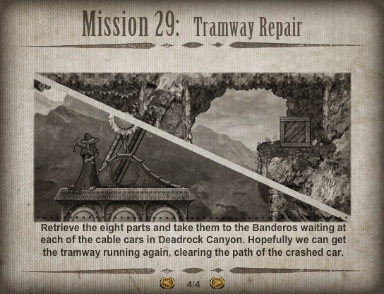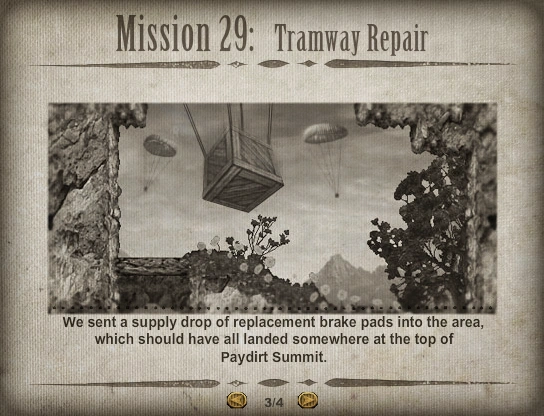 Quest giver: The crash has been assessed, and it appears the brakes were worn dangerously thin on all the cable cars. The Banderos have offered to fix the cable cars if we supply them with the necessary parts. We sent a supply drop with the replacement brake pads into the area, and they should have landed somewhere at the top of Paydirt Summit. Retrieve the eight parts and take them to the Banderos waiting at each of the cable cars in Deadrock Canyon. Hopefully, we can get the tramway running again, clearing the path of the crashed car.
