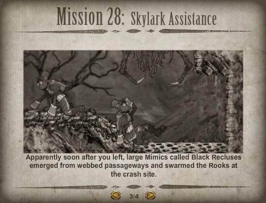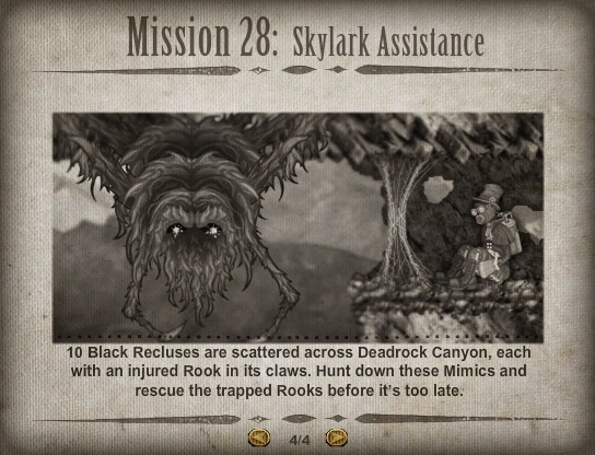 Quest giver: Mission Deployment has sent the emergency reconnaissance ship known as the Skylark to pick up the injured Rooks in Deadrock Canyon. When the Skylark team landed, only one injured Rook was found at the crash site, with a horrific tale of what happened to the rest of the group. Apparently, soon after you left, large Mimics called Black Recluses emerged from the webbed passageways and swarmed the Rooks at the crash site. 10 Black Recluses are scattered across Deadrock Canyon, each with an injured Rook in its claws. Hunt down these Mimics and rescue the trapped Rooks before it's too late.