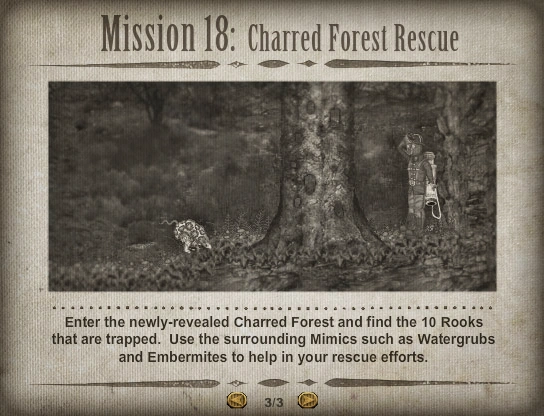 Quest giver: The Fire Brigade has gotten the forest fire under moderate control, though ten Rooks haven't returned from firefighting. Enter the newly-revealed Charred Forest and find the 10 Rooks that are trapped. Use the surrounding Mimics such as Watergrubs and Embermites to help in your rescue efforts.