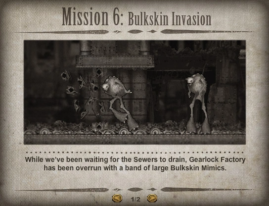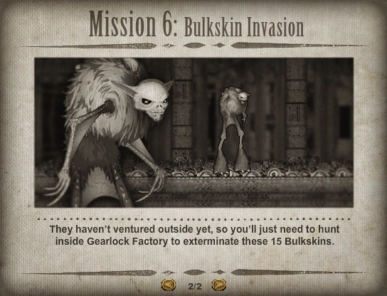 Quest giver: While we've been waiting for the Sewers to drain, the Gearlock Factory has been overrun with a band of large Bulkskin Mimics. They haven't ventured outside yet, so you'll just need to hunt inside the Gearlock Factory to exterminate these 15 Bulkskins.