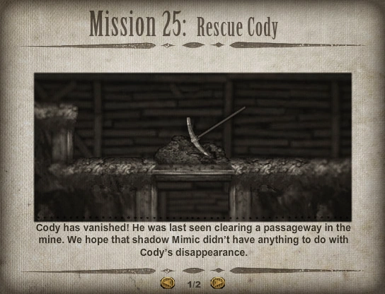 Quest giver: Cody has vanished! He was last seen clearing a passageway in the mine. We hope that the shadow Mimic didn't have anything to do with Cody's disappearance. We need you to head into the newly uncovered passageways of the mines to find Cody, and possibly the exit.