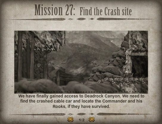 Quest giver: We have finally gained access to Deadrock Canyon. We need to find the crashed cable car and locate the Commander and his Rooks, if they have survived. Once you have located the crash site, quickly return to Mission Deployment. Once we have your detailed analysis, we can send the Skylark team to retrieve the injured Rooks.